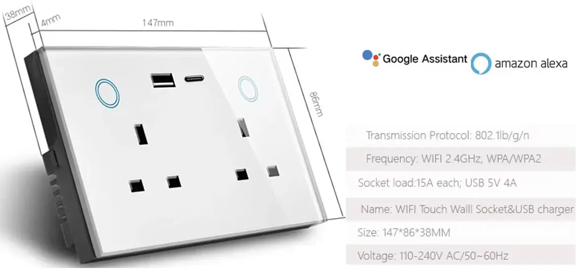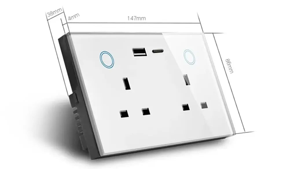 Transform your space with the Smart Wall Socket with Crystal Glass Touch, blending elegant design with cutting-edge convenience. Featuring a sleek glass panel, integrated USB-A and USB-C charging ports, and advanced smart features, it's a must-have upgrade for any modern home or office.